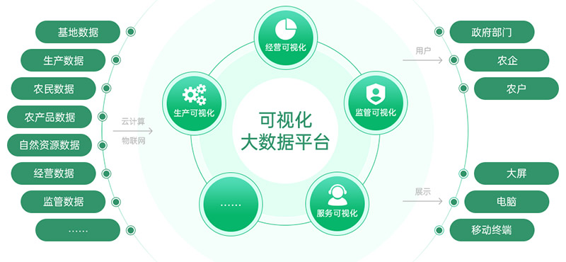 根據不同的客戶群體和產業需求,為高標準農田、特色果業基地、茶山、水產畜牧養殖等場景提供個性化定制解決方案,圍繞鄉村振興、美麗鄉村、政務服務、農場管理、產業支撐、物聯設備等主題需求展示可視化數據。